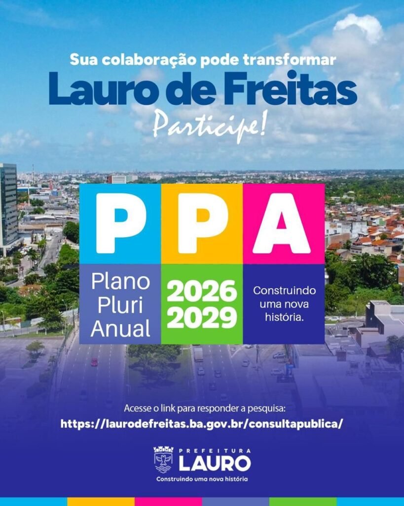 A Prefeitura de Lauro de Freitas prorrogou, até esta sexta-feira (15/8), o prazo para que os cidadãos interessados possam participar da consulta pública on-line para elaboração do Plano Plurianual (PPA) 2026-2029, disponível neste *link*, no site oficial do município.